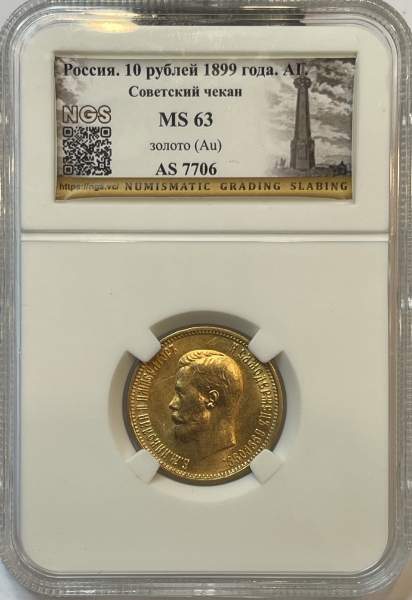 Вы всегда можете купить или продать, а также узнать текущую стоимость монеты - 'Золотая монета 10 рублей Николай II 1899г., в слабе NGS MS 63' в г. (). У нас Вы получите полную и необходимую консультация от квалифицированных специалистов и профессионалов, работающих на рынке инвестиций в драгметаллы уже долгое время. Мы стараемся предложить нашим клиентам лучшие цены выкупа и продажи на рынке (с минимальным спредом), а также гарантируем конфиденциальность всех проводимых сделок.