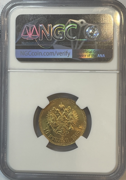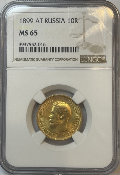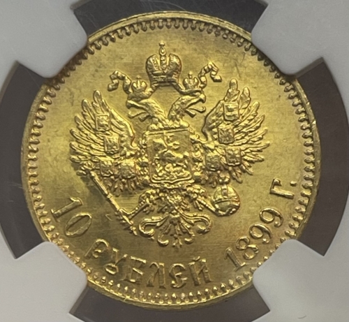 В центре изображен Малый Государственный Герб Российской империи - двуглавый орёл, головы которого увенчаны двумя коронами, третья, большая корона над ними. Все они соединены орденской лентой ордена Св. Апостола Андрея Первозванного. На груди орла расположен Московский герб, в щите изображен Георгий Победоносец с копьем поражающий дракона. Вокруг щита цепь ордена Св. Апостола Андрея Первозванного. На крыльях изображены гербы: Царства Казанского, Польского, Херсонеса Таврического, Астраханского, Сибирского, Грузинского, герб соединенных княжеств Киевского, Новгородского и Владимирского и герб Великого Княжества Финляндского — по 4 на каждое крыло. В правой лапе орла – скипетр, в левой – держава. Под ним слева направо изображены: номинал - надпись «10 РУБЛЕЙ» и дата выпуска «1899 Г.». По окружности канта имеются рельефные элементы, выполненные в виде зубцов.